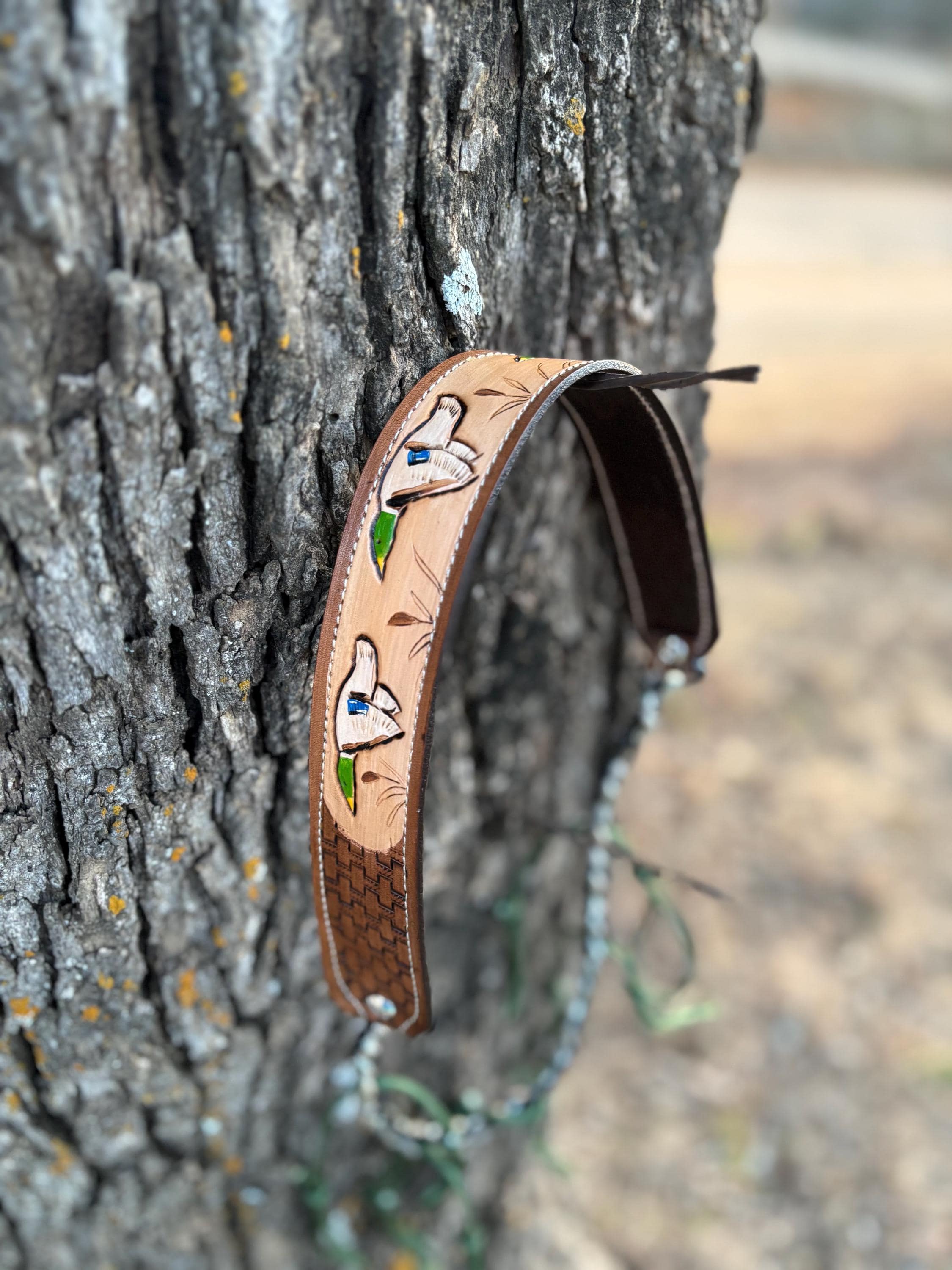 Quality hand made duck call holder with paracord call holders. Authentic leather hand tooled, stained, and painted. The bottom is strong hand braided paracord. Ready to hold all of your duck calls in one area.7